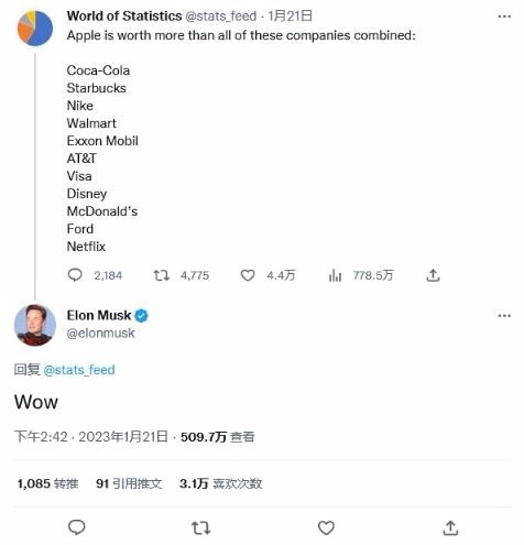The World Of Statistics 在最新推文中表示,蘋果公司的市值已經(jīng)超過(guò)了可口可樂、耐克等 11 家藍(lán)籌公司的市值總和。隨后馬斯克轉(zhuǎn)發(fā)了這條推文,并評(píng)論道:“WoW”。