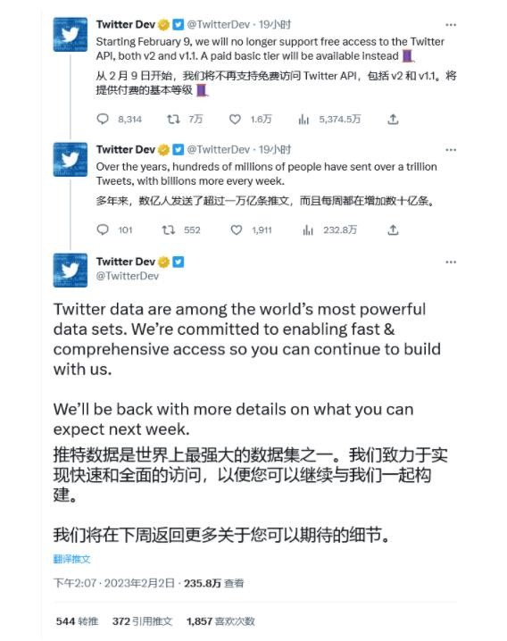 Twitter 官方開發(fā)者賬號在推文中表示:“我們宣布自 2 月 9 日開始,不再支持免費訪問 v1.1 和 v2 版本的 Twitter API,后續(xù)我們將推出付費的基礎(chǔ)套餐”。