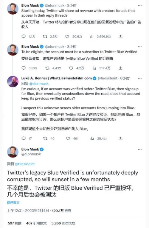 馬斯克在本周五的推文中表示:“Twitter 將于今天開始,向創(chuàng)作者分享嵌入其推文評(píng)論中的廣告收益”。
