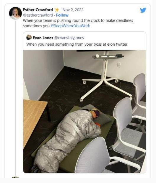 去年 11 月初,克勞福德還在推特上發(fā)布了一張自己睡在推特辦公室地板上的照片,包括睡袋和眼罩。她同時(shí)寫道:“當(dāng)你的團(tuán)隊(duì)日以繼夜地趕在最后期限前努力工作時(shí),有時(shí)你需要睡在辦公室中。”