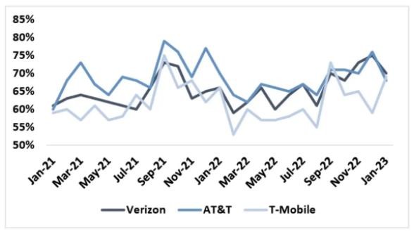 摩根大通在報(bào)告中指出:“iPhone 今年 1 月在美國三大運(yùn)營商(Verizon、AT&T 和 T-Mobile)中的銷售份額為 69%,去年 12 月為 70%。但表現(xiàn)比前代更優(yōu)秀,iPhone 13 周期中的占比為 67%;而 iPhone 12 周期中的占比為 60%”。