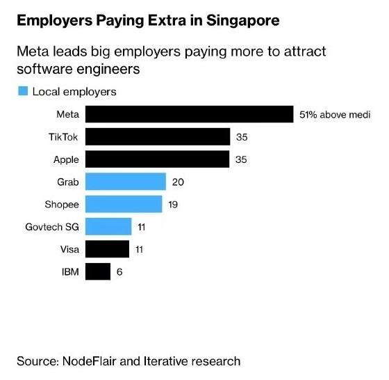 上述報(bào)告顯示,在新加坡科技行業(yè),從業(yè)者最向往的幾家公司包括字節(jié)跳動、新加坡政府技術(shù)局,以及前述互聯(lián)網(wǎng)巨頭 Sea 旗下的電子商務(wù)子公司 Shopee,這些公司的吸引力超過了蘋果、維薩卡和 Meta 等海外公司。