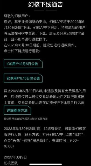 幻核 APP 下線后,持有餐品的用戶將無法在 APP 中查詢、下載、展示及分享已購數(shù)字藏品,且不能再進(jìn)行退款操作。