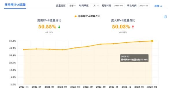 據(jù)國(guó)家 IPv6 發(fā)展監(jiān)測(cè)平臺(tái)統(tǒng)計(jì)數(shù)據(jù),2023 年 2 月,我國(guó)移動(dòng)網(wǎng)絡(luò) IPv6 占比達(dá)到 50.08%,首次實(shí)現(xiàn)移動(dòng)網(wǎng)絡(luò) IPv6 流量超過(guò) IPv4 流量的歷史性突破,標(biāo)志著我國(guó)推進(jìn) IPv6 規(guī)模部署及應(yīng)用工作迎來(lái)了新的里程碑。