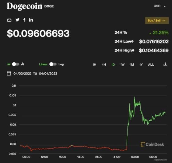 加密貨幣狗狗幣價(jià)格一度飆升超過(guò) 30%,現(xiàn)漲 21.25%。此前推特 CEO 埃隆·馬斯克將公司網(wǎng)站上標(biāo)志性的“小藍(lán)鳥”換成了“柴犬”卡通形象。 (碼上科技)