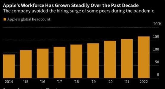 截至去年 9 月,蘋(píng)果公司共有 16.4 萬(wàn)名員工。在疫情期間,該公司沒(méi)有像其他大型科技公司那樣迅速擴(kuò)大員工規(guī)模,也因此避免了大規(guī)模裁員。