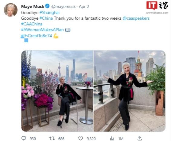 美國(guó)億萬(wàn)富翁、特斯拉創(chuàng)始人、推特 CEO 埃隆?馬斯克的母親梅耶?馬斯克近日結(jié)束了她的中國(guó)之行,她在社交媒體上分享了她在上海、湖州、廣州、蘇州、廈門、成都、武漢等地的旅游見聞,稱贊中國(guó)的美景和友好的人們,感謝中國(guó)給她帶來了兩周的美好時(shí)光。