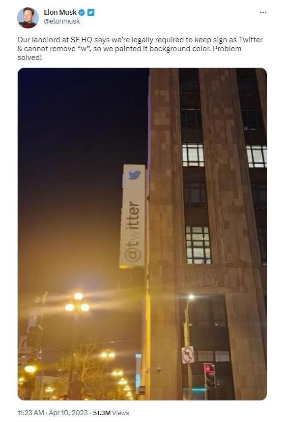 馬斯克在照片配文中寫道:“我們舊金山總部的房東說,法律要求保留推特的標(biāo)識,不能刪除‘w’,所以我們把它涂成了背景色。這樣問題就解決了!”