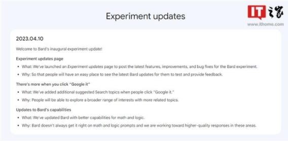 Bard 是谷歌今年早些時(shí)候發(fā)布的一個(gè)“實(shí)驗(yàn)性的對(duì)話式人工智能服務(wù)”,目前已經(jīng)在美國(guó)和英國(guó)開(kāi)放使用。谷歌表示,Bard 的模型正在不斷調(diào)整,但如果沒(méi)有一個(gè)集中的地方來(lái)展示它的變化,用戶很難知道它到底能做什么。因此,谷歌創(chuàng)建了這個(gè)“實(shí)驗(yàn)更新”頁(yè)面,用戶可以在這里找到關(guān)于 Bard 最近的更新信息,包括新功能和錯(cuò)誤修復(fù)。每個(gè)更新都包括了“是什么”和“為什么”的說(shuō)明。對(duì)于這個(gè)頁(yè)面本身,谷歌說(shuō)它是為了讓“用戶有一個(gè)地方來(lái)方便地查看最新的 Bard 更新,并進(jìn)行測(cè)試和反饋”。