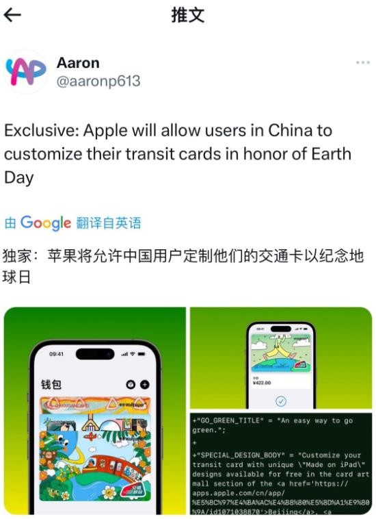 據(jù) Aaron 消息,蘋果 Apple Pay 將在中國地區(qū)上線交通卡卡面圖案自定義活動,以此來紀(jì)念地球日。