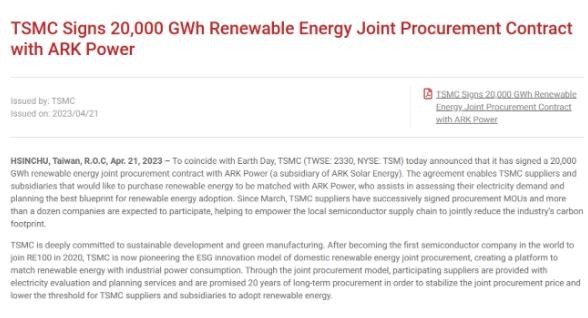 臺(tái)積電宣布與誠(chéng)新電力(誠(chéng)新綠能子公司)簽署長(zhǎng)期協(xié)議,將在 20 年內(nèi)每年購(gòu)買 1000GWh 可再生能源,共 20000GWh,約為 25 萬(wàn)戶家庭一年用電量。臺(tái)積電將每年認(rèn)購(gòu) 500GWh,另外 500GWh 則邀請(qǐng)供應(yīng)商共同認(rèn)購(gòu),預(yù)計(jì)每年將降低 50 萬(wàn)公噸二氧化碳排放量。