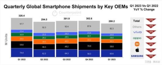 Counterpoint 公布的數(shù)據(jù)顯示,Q1 手機銷量 TOP5 品牌為三星、蘋果、小米、OPPO 和 vivo,對應的出貨量和降幅分別為 (三星)6060 萬部、同比下降 19%,(蘋果)5800 萬部、同比下降2%,(小米)3050 萬部、同比下降 22%,(OPPO)2800 萬部、同比下降 10%,(vivo)2080 萬部,同比下降 18%。全球智能手機市場整體出貨量為 2.802 億部,同比下降 14%。