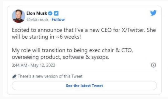 馬斯克通過(guò)推特表示:“很高興宣布,我已經(jīng)為X/推特聘請(qǐng)了一位新的首席執(zhí)行官,她將在大約六周內(nèi)開始工作。我本人將逐漸過(guò)渡到執(zhí)行主席兼首席技術(shù)官的角色,負(fù)責(zé)產(chǎn)品、軟件和系統(tǒng)運(yùn)營(yíng)。”