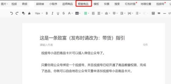想要開(kāi)啟該功能,用戶(hù)需要用公眾號(hào)綁定一個(gè)開(kāi)啟了商品櫥窗權(quán)限的公眾號(hào),之后在公眾號(hào)內(nèi)容編輯頁(yè),點(diǎn)擊上方功能欄"櫥窗商品",選擇要插入的商品即可插入到文章中。