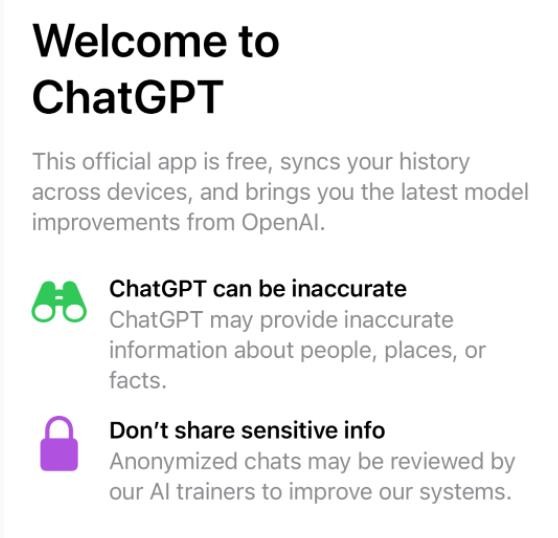 登錄后會(huì)出現(xiàn)歡迎界面,顯示 APP 是免費(fèi)使用,可以和網(wǎng)頁端打通同步歷史。同時(shí)也提醒用戶,ChatGPT 是有可能提供不準(zhǔn)確的信息,并且建議用戶不要提供敏感信息,因?yàn)槟涿畔⒁部赡軙?huì)被 OpenAI 的 AI 訓(xùn)練員用來改善系統(tǒng)。