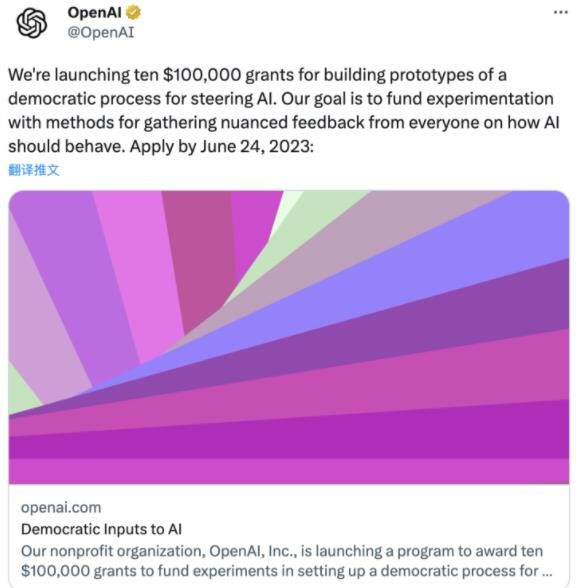 與此同時(shí),OpenAI 周四表示,將從一只 100 萬(wàn)美元(IT之家備注:當(dāng)前約 708 萬(wàn)元人民幣)基金中拿出 10 筆等額撥款,每筆 10 萬(wàn)美元(當(dāng)前約 70.8 萬(wàn)元人民幣),用于民主進(jìn)程的實(shí)驗(yàn),以確定如何管理 AI 軟件,以解決偏見(jiàn)和其他問(wèn)題。