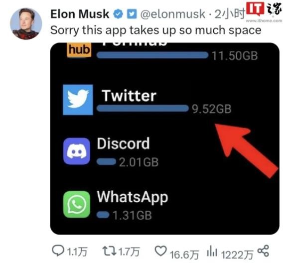 億萬富翁馬斯克今日在 Twitter 上分享了一張手機存儲空間的截圖,顯示 Twitter 應(yīng)用占用了 9.52 GB,比大部分其他應(yīng)用都多,他在推文中為此向用戶道歉。