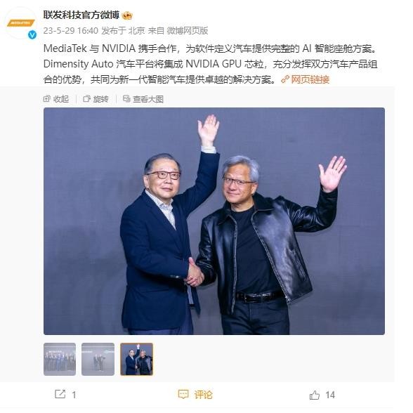 英偉達 CEO 黃仁勛與聯(lián)發(fā)科 CEO 蔡力行共同宣布雙方達成合作,二者將共同開發(fā)車用 SoC,并將為軟件定義汽車提供完整的 AI 智能座艙方案。
