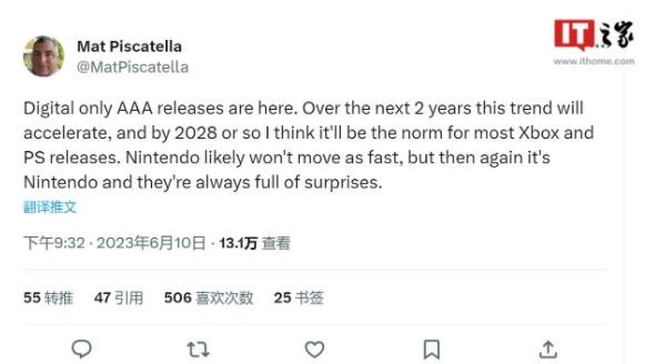 Mat Piscatela 表示在接下來兩年內(nèi),3A 大作“僅發(fā)布數(shù)字版本”這一情況將會普遍,他認為到了 2028 年,絕大多數(shù) Xbox 和 PlayStation 平臺上游戲都將只有數(shù)字版本,而任天堂此類日廠的轉(zhuǎn)變并不會這么“迅速”,因此 2028 年之后依然會提供可選的實體版本游戲。