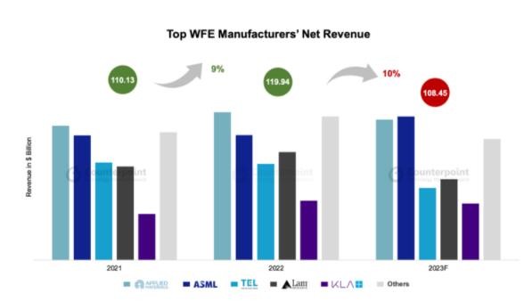 報告中指出 WFE 市場在連續(xù) 3 年增長之后,預估 2023 年凈收入為 1084.5 億美元(當前約 7754.18 億元人民幣),同比下降 10%。