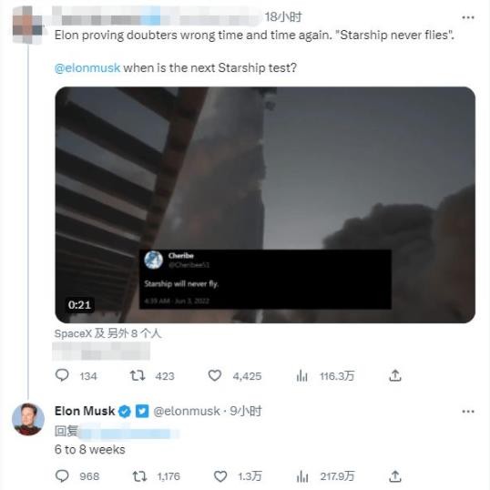 馬斯克在推特上回應有關星際飛船最新進展時表示,下一次測試將在“6 到 8 周內(nèi)”進行。