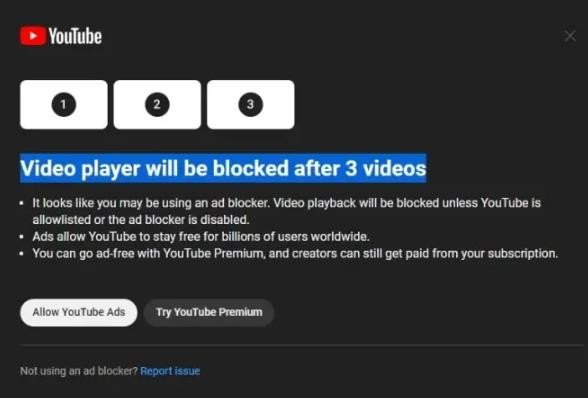 YouTube 正在進(jìn)行一項新的實驗,旨在限制廣告攔截器的使用,要求用戶在觀看三個視頻后關(guān)閉廣告攔截器或者購買高級訂閱服務(wù)。
