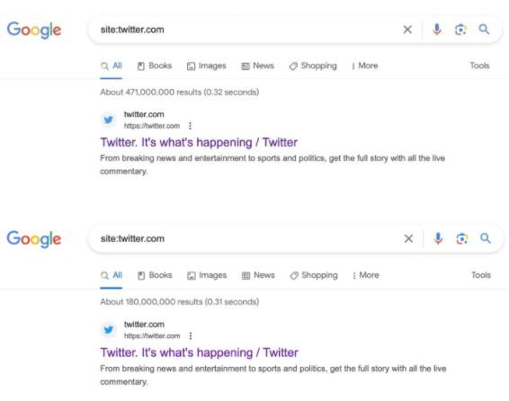 報(bào)道中指出推特在上周五施行“新規(guī)”之后,Google Search 刪除了超過一半的推特索引 URL 地址,被谷歌索引的推文數(shù)量從 4.71 億條銳減至 1.8 億條,這意味著谷歌對 Twitter.com 的索引飽和度下降了 62%。