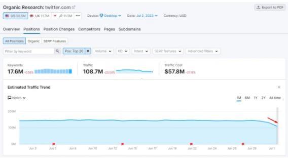 Glenn Gabe 在 Twitter 上分享了一張第三方工具 Semrush 的截圖,顯示 Twitter 在谷歌搜索中的可見度下降:
