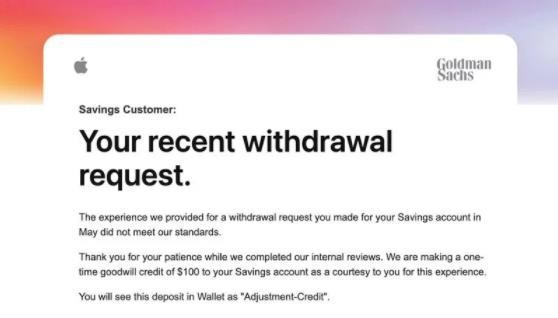 蘋果和高盛為了補(bǔ)償這些提現(xiàn)困難的用戶,表示一次性補(bǔ)償 100 美元,目前尚不清楚有多少 Apple Savings 用戶收到了這些“善意信貸”。