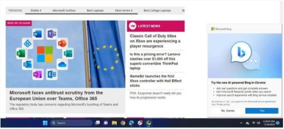 網(wǎng)友 Kevin Okemwa 近日打開(kāi)谷歌 Chrome 瀏覽器之后,收到了“在 Chrome 中體驗(yàn)全新 AI 驅(qū)動(dòng)的必應(yīng)”通知,點(diǎn)擊之后會(huì)打開(kāi)新版必應(yīng)頁(yè)面,并推薦用戶安裝和使用必應(yīng)的擴(kuò)展程序。