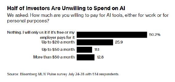 但對于今年上半年炙手可熱的 AI 技術(shù),這些受訪者目前還沒有全力以赴地投入。其中一半的人不愿自掏腰包,購買 AI 工具來幫助他們的個(gè)人或商業(yè)生活;而大多數(shù)公司也不打算使用 AI 工具進(jìn)行交易或投資。