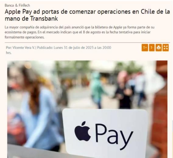 據(jù)智利金融報(bào)紙《Diario Financeiro》報(bào)道,智利銀行業(yè)巨頭 Transbank 在社交媒體上分享了一篇帖子:歡迎 Apple Pay 進(jìn)入該國。盡管該帖子后來被刪除,但記者 Pedro Martín 獨(dú)立向“至少四個來自金融機(jī)構(gòu)的消息來源”證實(shí),Apple Pay 定于 8 月 8 日在智利正式推出。