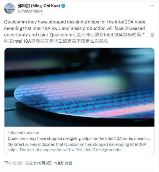 郭明錤今晚發(fā)布最新研究報告。他表示,最新調(diào)查顯示高通已經(jīng)停止開發(fā) Intel 20A 芯片。