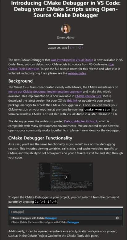 微軟日前宣布與 Kitware 合作,在 CMake 3.27 版本中合并 CMake 調(diào)試器,VS Code 目前已經(jīng)可以使用 CMake 調(diào)試器。