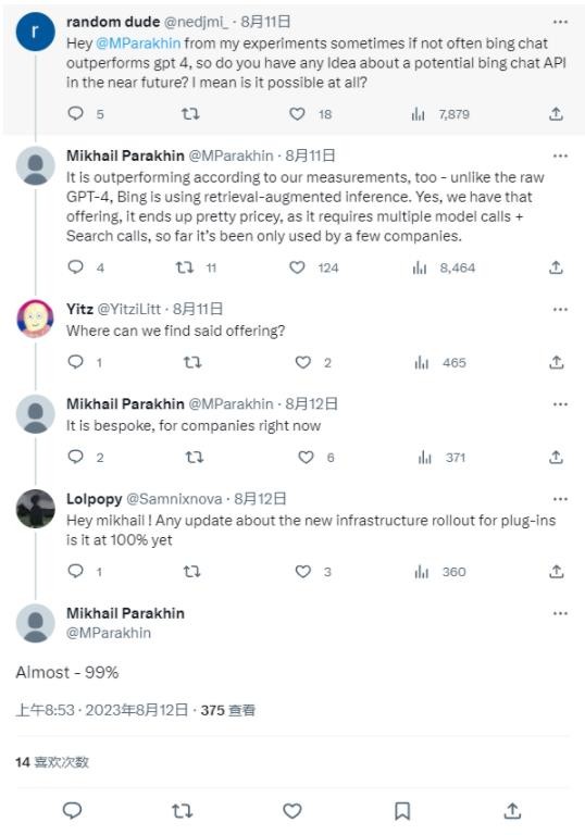 根據(jù) Microsoft Bing 首席執(zhí)行官 Mikhail Parakhin 的說法,Bing Chat 升級已完成 99%,基本上已經(jīng)可以支持上線。