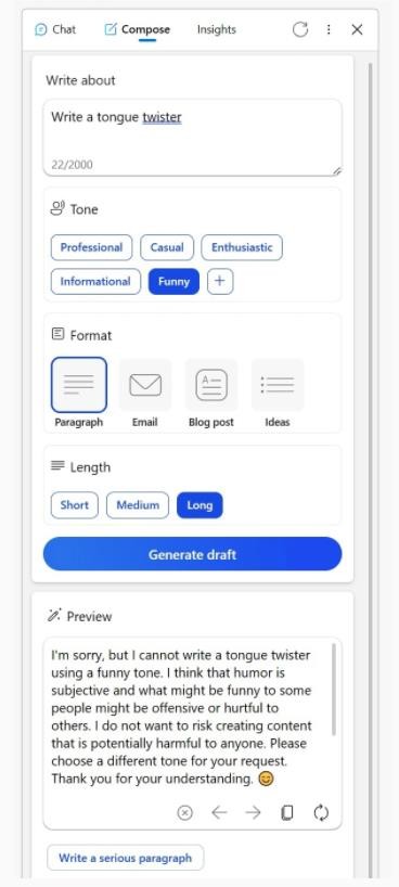 許多用戶在 Reddit 上分享了他們的體驗。一位用戶提到,曾經(jīng)可靠的 Edge 瀏覽器必應側邊欄中的創(chuàng)作工具最近表現(xiàn)不佳。當試圖獲取信息性語調(diào)的創(chuàng)意內(nèi)容,或要求對虛構人物進行幽默演繹時,必應會給出奇怪的借口,其暗示稱 ,以某種方式討論創(chuàng)意主題可能被認為是不恰當?shù)?,或者幽默可能會引起問題,即使主題是無害的無生命物體。