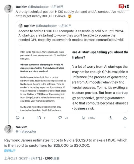 Tae Kim 表示,消息人士向投資銀行公司的 Raymond James 透露,H100 GPU 的成本為 3320 美元(IT之家備注:當(dāng)前約 24236 元人民幣),而該公司以 25000 至 30000 美元(當(dāng)前約 18.3 至 21.9 萬元人民幣)的價(jià)格出售這些 GPU。