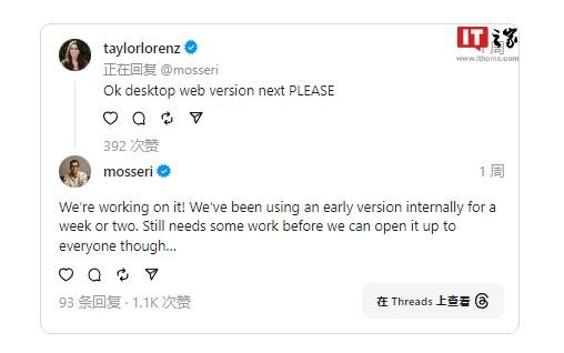 IT之家注意到,Instagram 負(fù)責(zé)人 Adam Mosseri 周五在他的 Instagram 個(gè)人主頁(yè)上表示,Threads 的網(wǎng)頁(yè)版即將推出,并已在 Meta 內(nèi)部進(jìn)行測(cè)試。