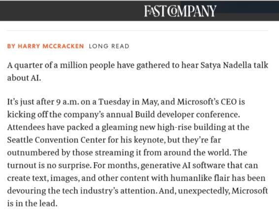 外媒 Fast Company 的一篇新文章概述了微軟在最近大量 AI 頭條新聞中的領(lǐng)先地位,該雜志表示,這在很大程度上要?dú)w功于其首席執(zhí)行官納德拉的“真知灼見(jiàn)”。