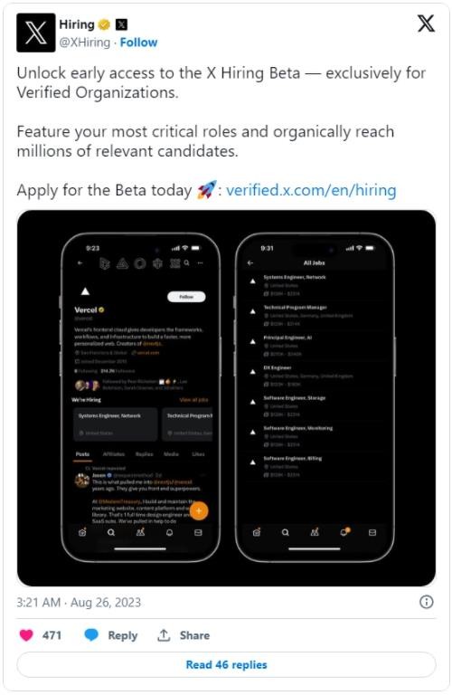 在私信中推出視頻聊天、語音聊天功能之后,X 今天宣布上線 Beta 版 X Hiring 平臺(tái),希望將其打造成為比肩 LinkedIn 的招聘平臺(tái)。