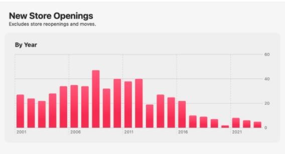 圖表顯示蘋果公司在 2012 年開設(shè)了 40 家新店,而在 2016 年縮短到 20 家,2017 年后這個數(shù)字進(jìn)一步減少。