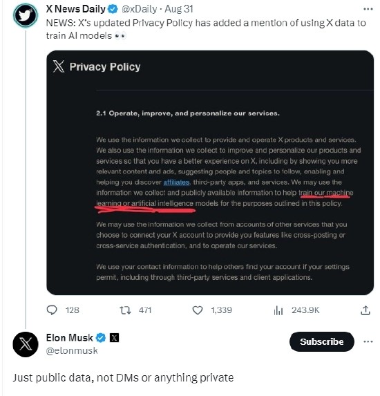 對此,馬斯克在 X 上回應(yīng)稱,X 只會使用公開的信息來訓(xùn)其練人工智能模型,不會使用任何私有的內(nèi)容。