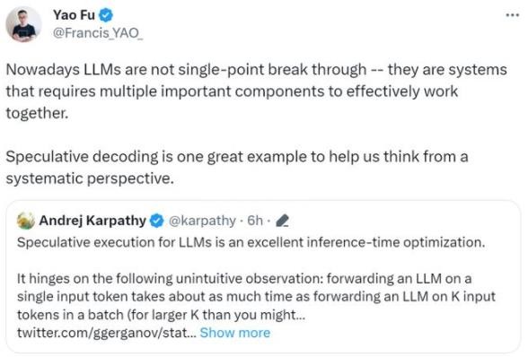 介紹完「Speculative decoding」,我們?cè)倩氐?Karpathy 的推特。Karpathy 是針對(duì)下面內(nèi)容回復(fù)的。