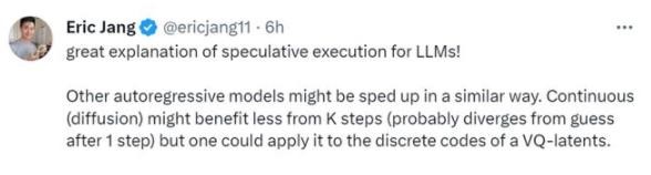 人形機(jī)器人公司 1X Technologies 的 AI 副總裁 Eric Jang 評(píng)價(jià)道:「Karpathy 很好的解釋了 LLM 的 speculative execution。其他自回歸模型可能會(huì)以類似的方式加速。連續(xù)(擴(kuò)散)模型可能從 K 步中獲益較少(可能在第 1 步后偏離猜測(cè)),但可以將其應(yīng)用于 VQ-latents 的離散代碼?!?/p>