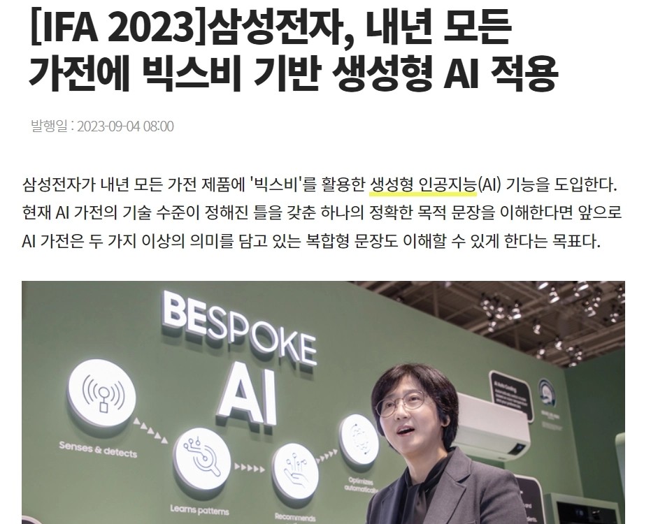 據(jù)韓媒 etnews 報(bào)道,三星電子家用電器部門(mén)副總裁 Miyoung Yu 在 IFA 2023 展會(huì)上宣布,三星電子明年將在所有家用電器中引入基于 Bixby 的生成式 AI 功能。