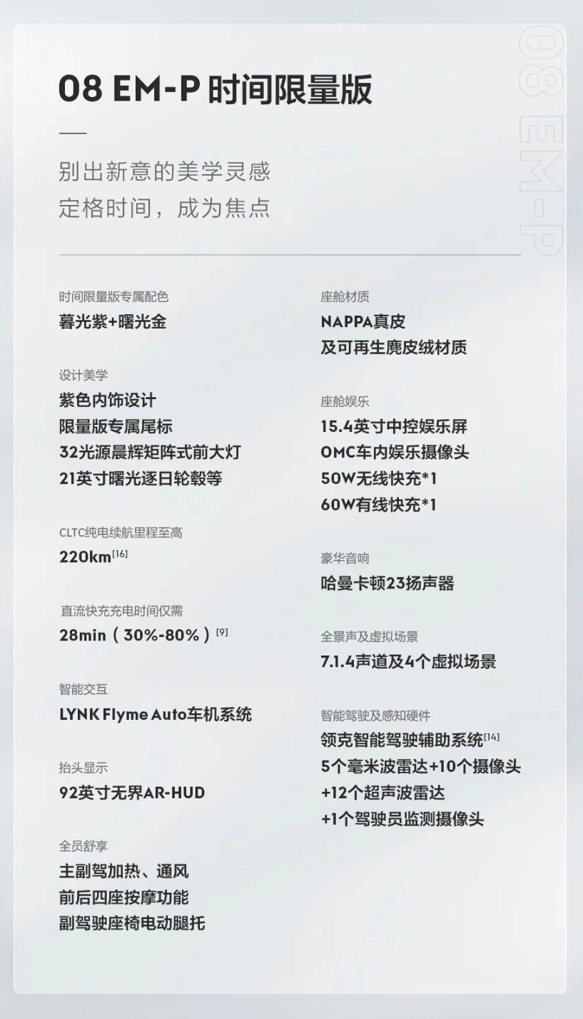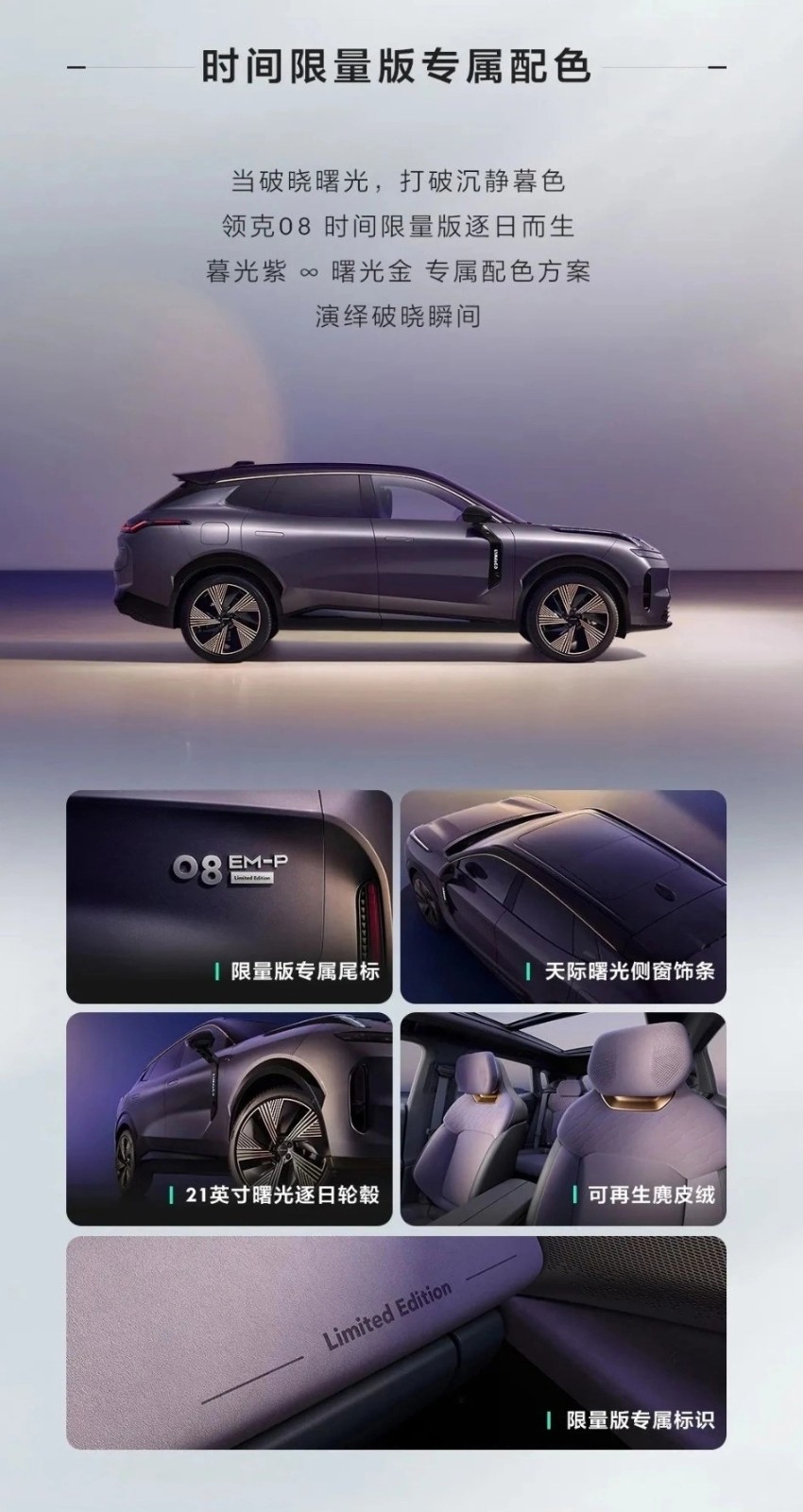 此外,時(shí)間限量版擁有專(zhuān)屬暮光紫 ∞ 曙光金配色,搭載專(zhuān)屬尾標(biāo)、21 英寸曙光逐日輪轂等。