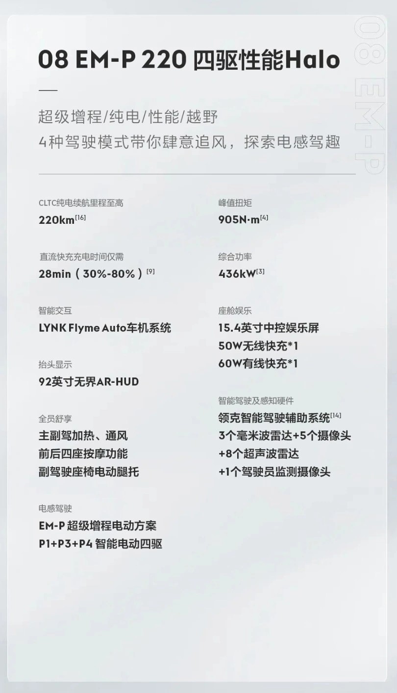 三電機(jī)四驅(qū)版的領(lǐng)克 08 采用 1.5T 電混發(fā)動(dòng)機(jī)和三電機(jī)(P1+P3+P4)布局,綜合功率 436kW,最高扭矩可達(dá) 905N?m,官方宣稱(chēng)百公里加速時(shí)間為 4.6 秒。