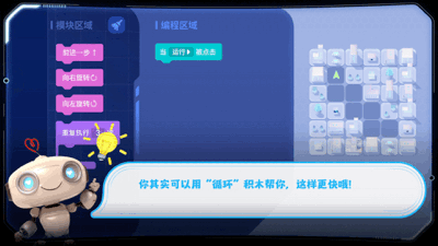 循環(huán)結(jié)構(gòu)的編程知識(shí)同樣被隱藏在游戲互動(dòng)中,讓青少年了解如何能提升效率。