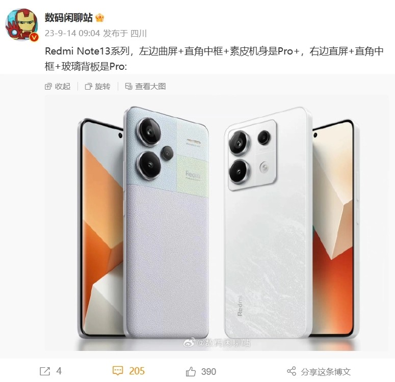 博主 @數(shù)碼閑聊站 稱,左邊曲屏 + 直角中框 + 素皮機(jī)身是 Redmi Note 13 Pro+,右邊直屏 + 直角中框 + 玻璃背板是 Redmi Note 13 Pro。