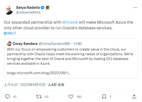 納德拉在隨后發(fā)布的推文中表示:“我們擴(kuò)展了和甲骨文的合作關(guān)系,讓微軟 Azure 成為現(xiàn)有唯一能運(yùn)行甲骨文數(shù)據(jù)庫服務(wù)的其它云提供商”。